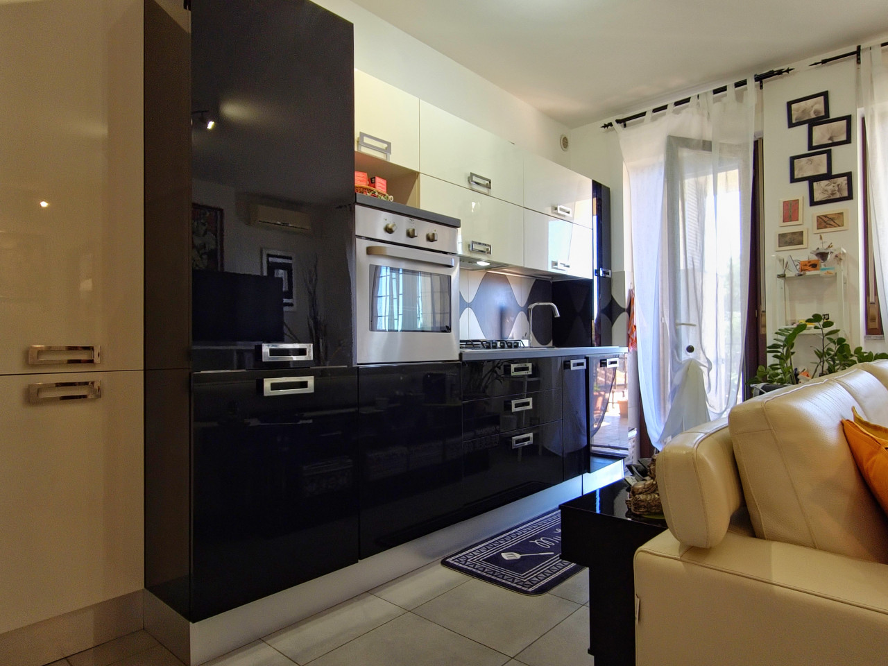 L’ingresso della casa è direttamente nella luminosa zona giorno, con salone e cucina a vista e grandi vetrate panoramiche che danno accesso al terrazzo di 20 mq che creano uno spazio ideale per momenti di convivialità con amici oppure in famiglia.