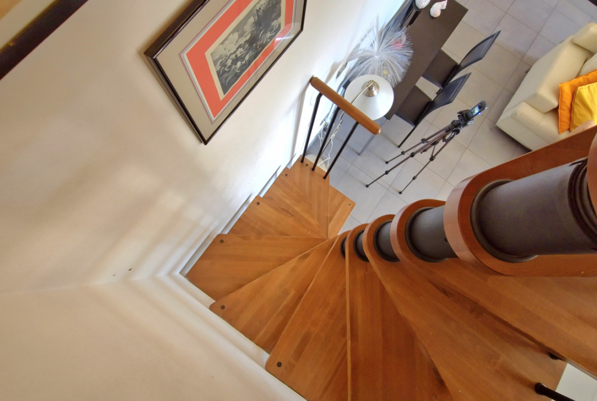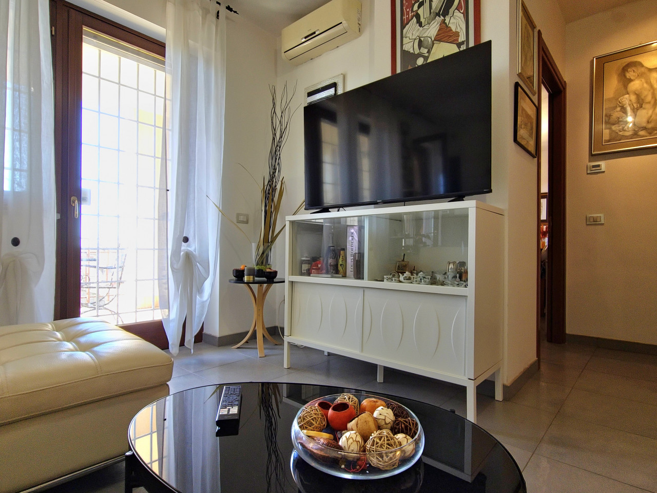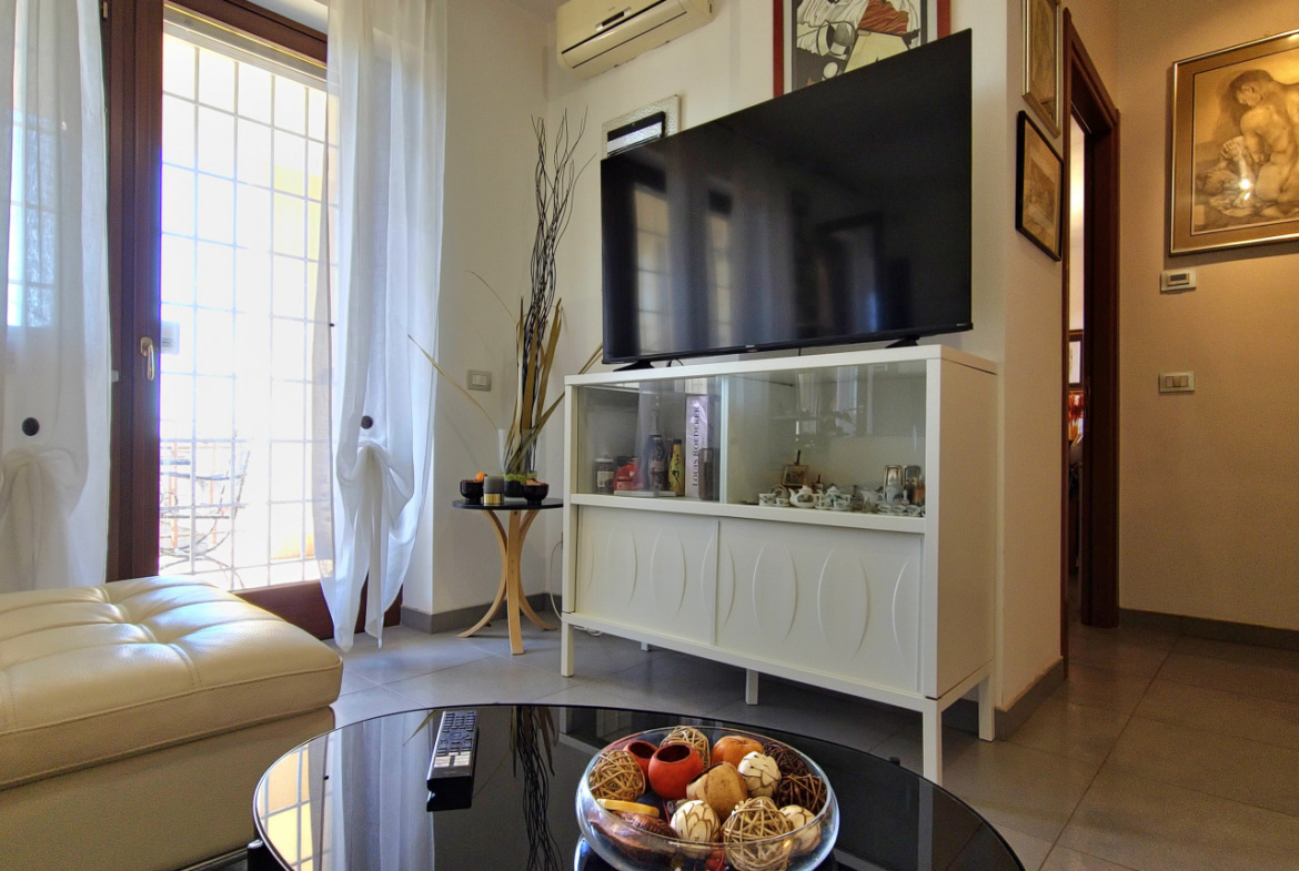 L’appartamento è dotato con ogni comfort moderno: aria condizionata, infissi in legno con doppio vetro per un perfetto isolamento termico e acustico, grate di sicurezza e sistema di allarme per la vostra totale serenità.