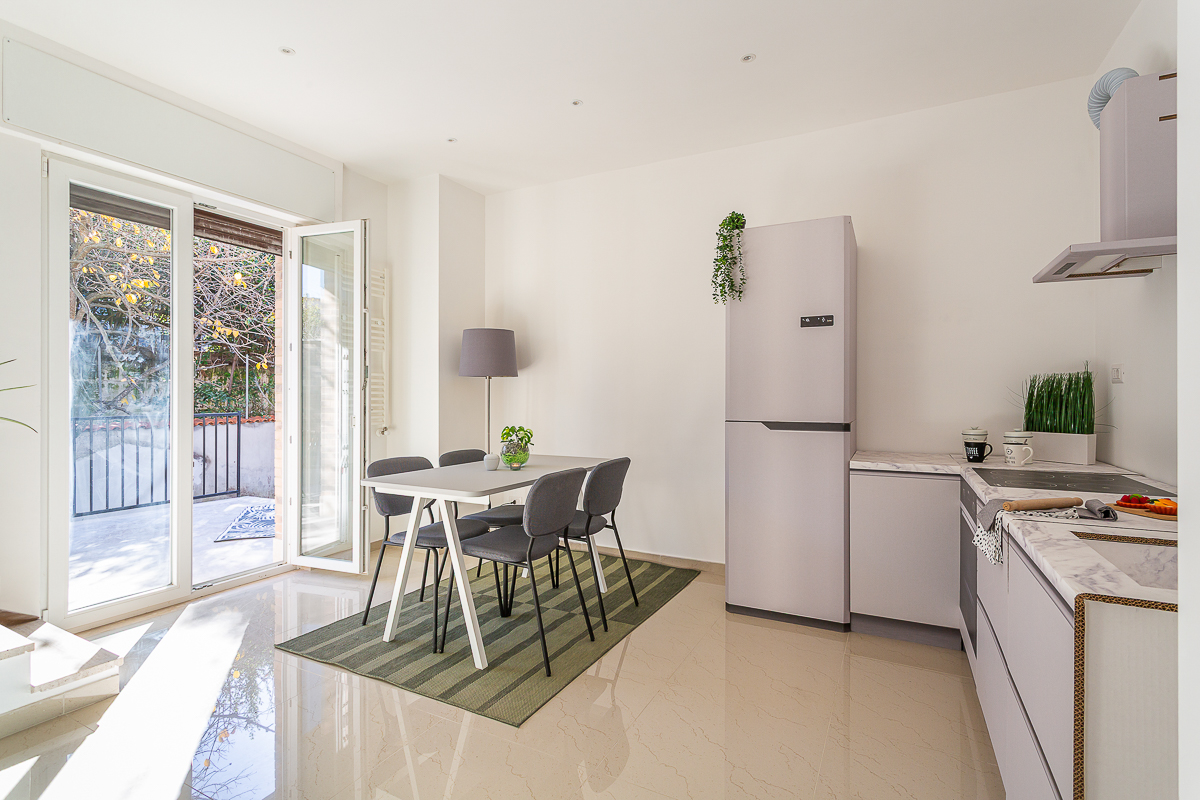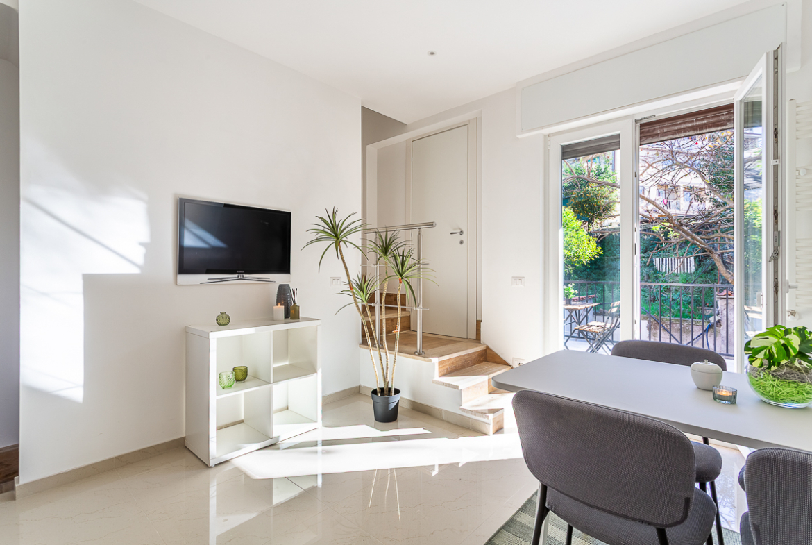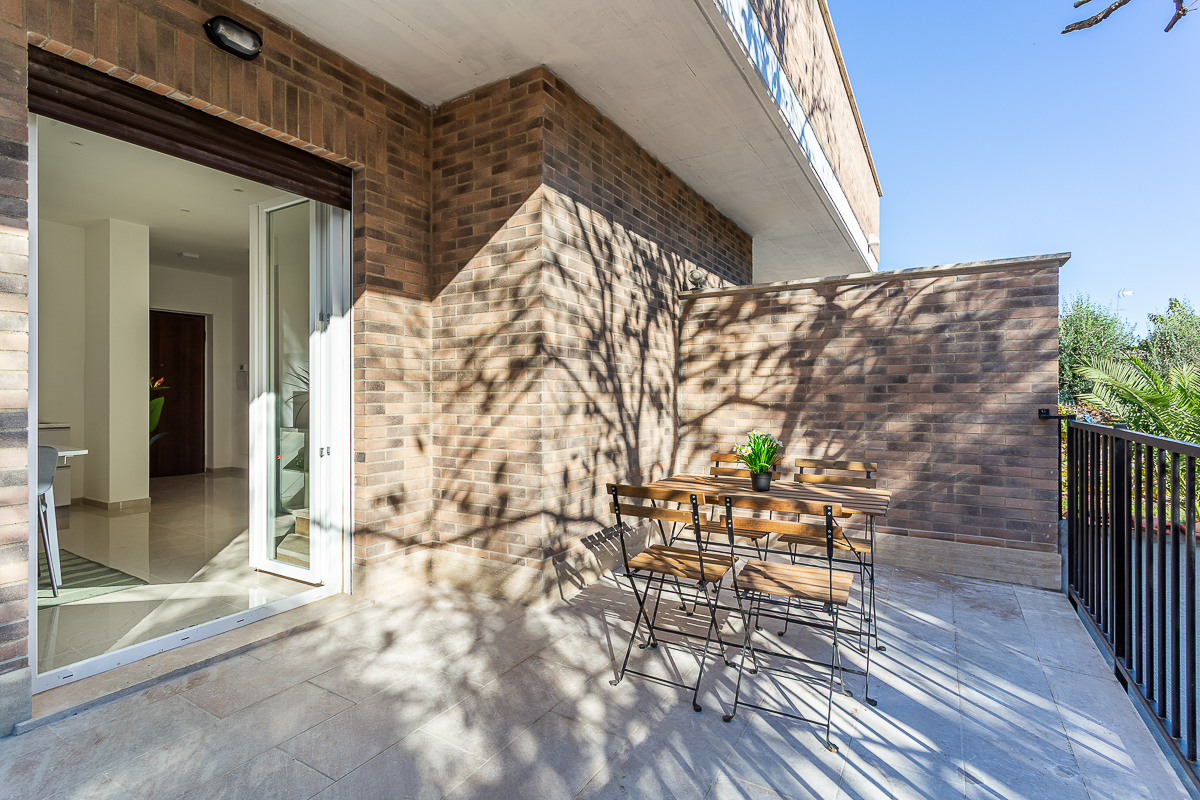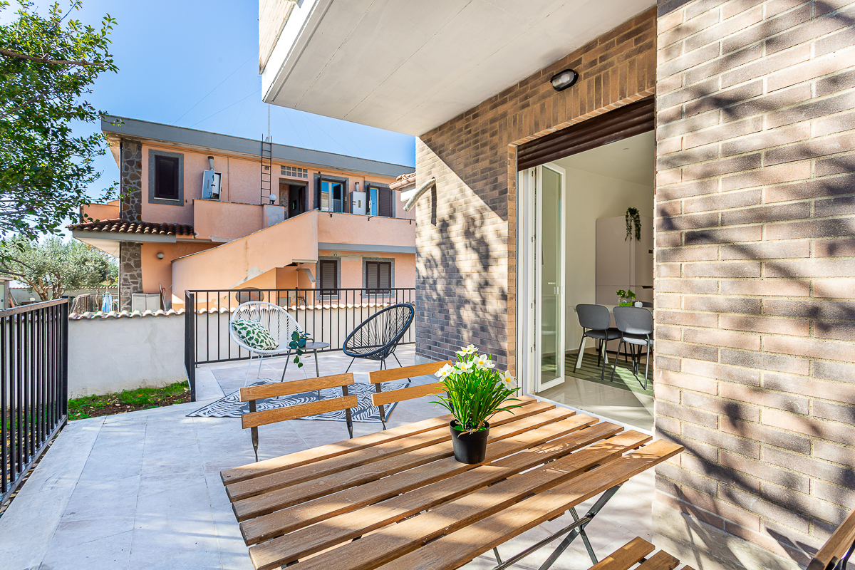 Dal soggiorno si accede al terrazzo abitabile, con locale tecnico, e all’ampio giardino privato, perfetto per godersi il relax e momenti di convivialità all’aria aperta.