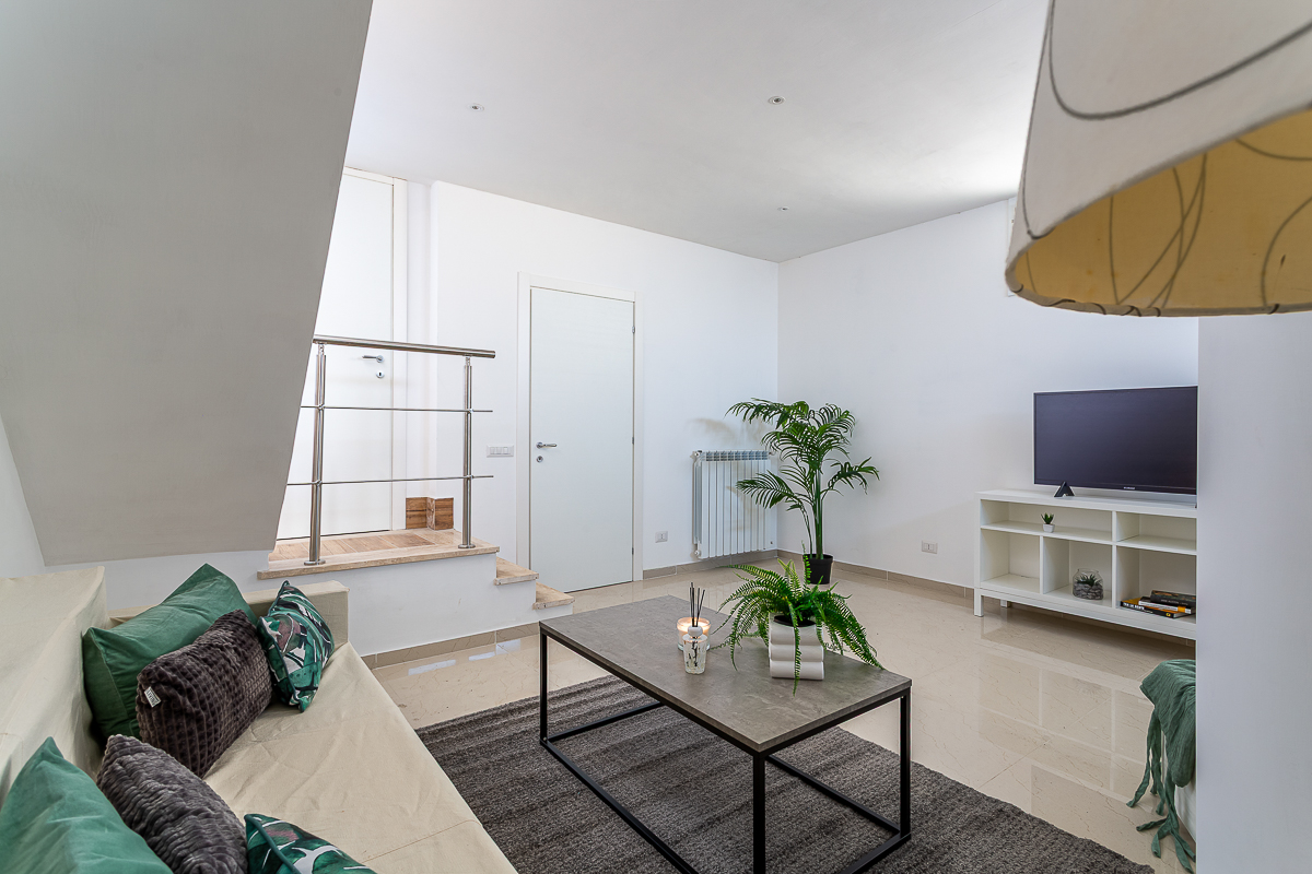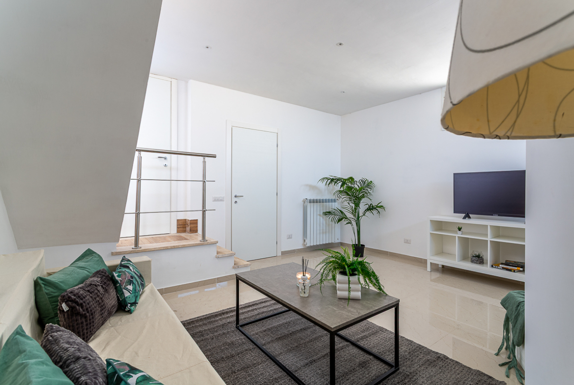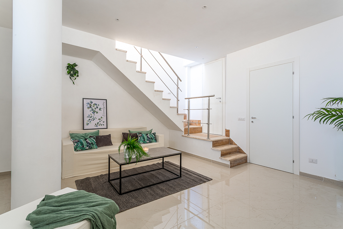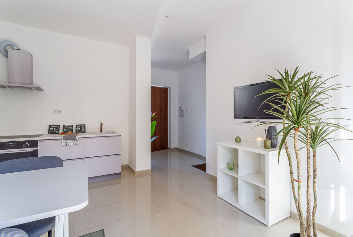 Un ingresso accogliente introduce alla luminosa zona living open space, con cucina a vista e soggiorno armoniosamente integrati.