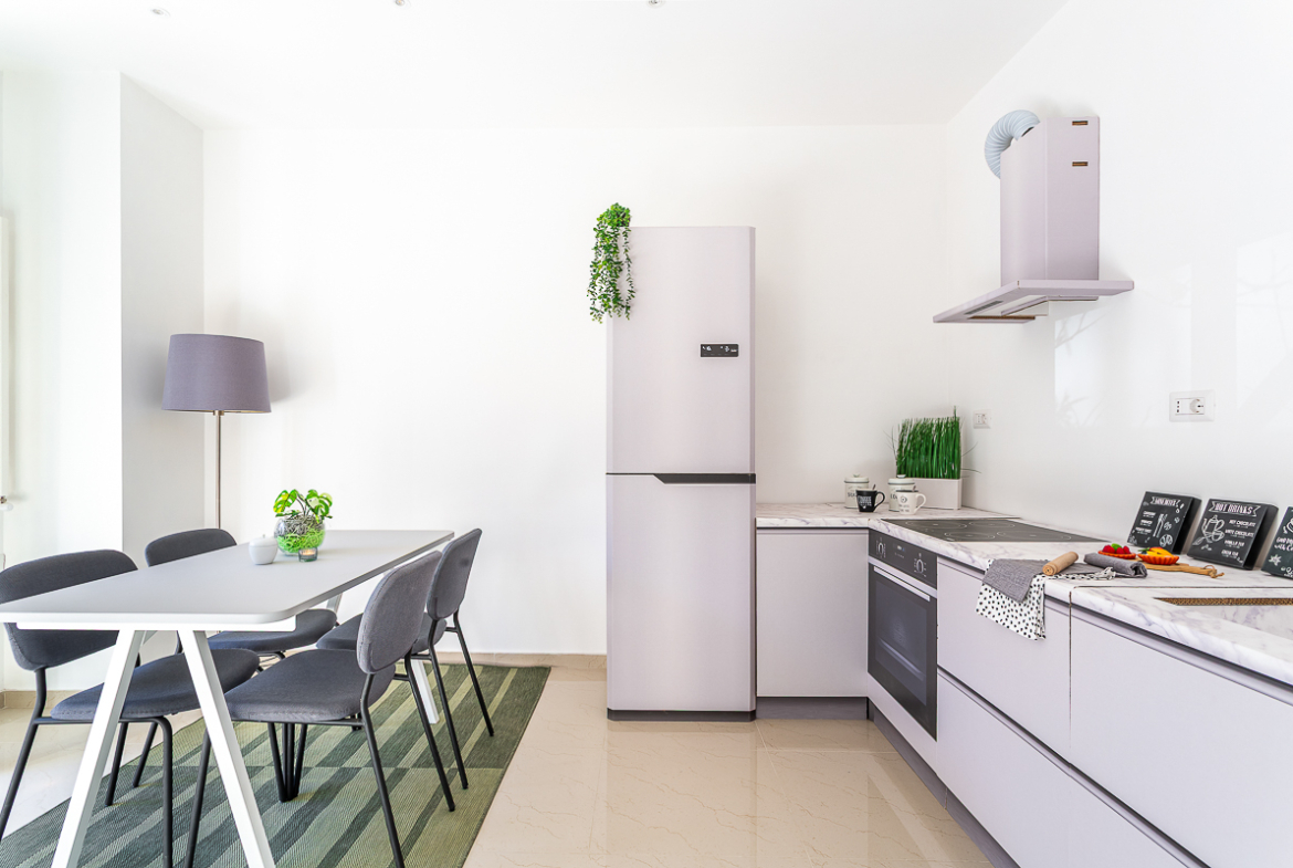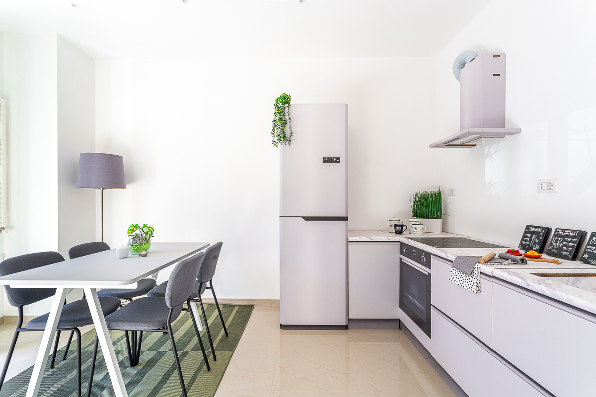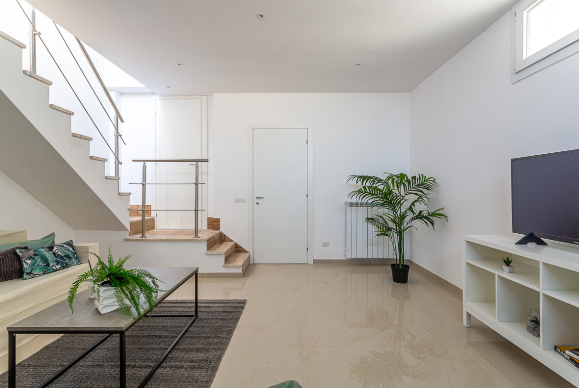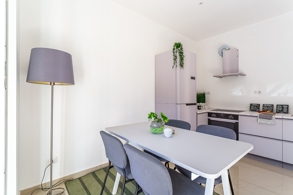 Un ingresso accogliente introduce alla luminosa zona living open space, con cucina a vista e soggiorno armoniosamente integrati.